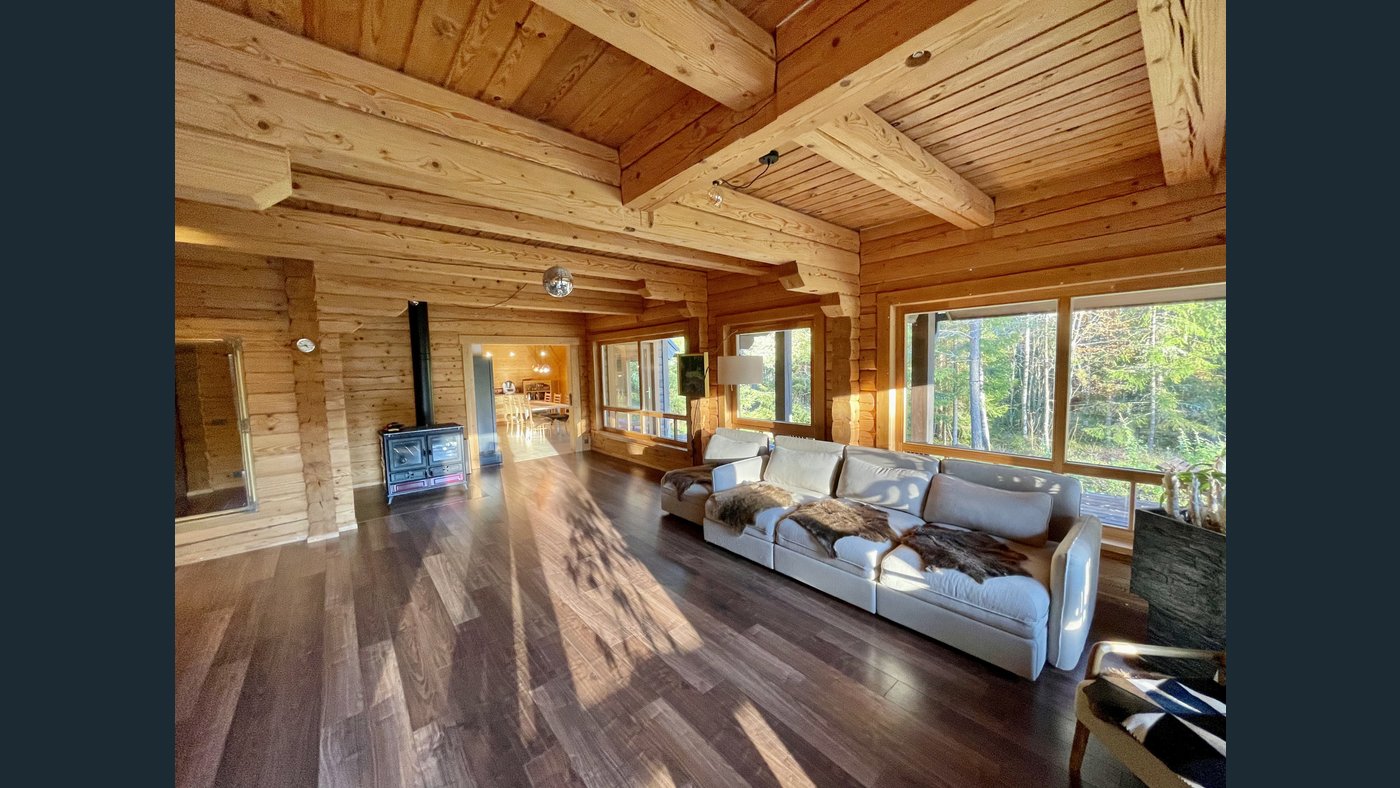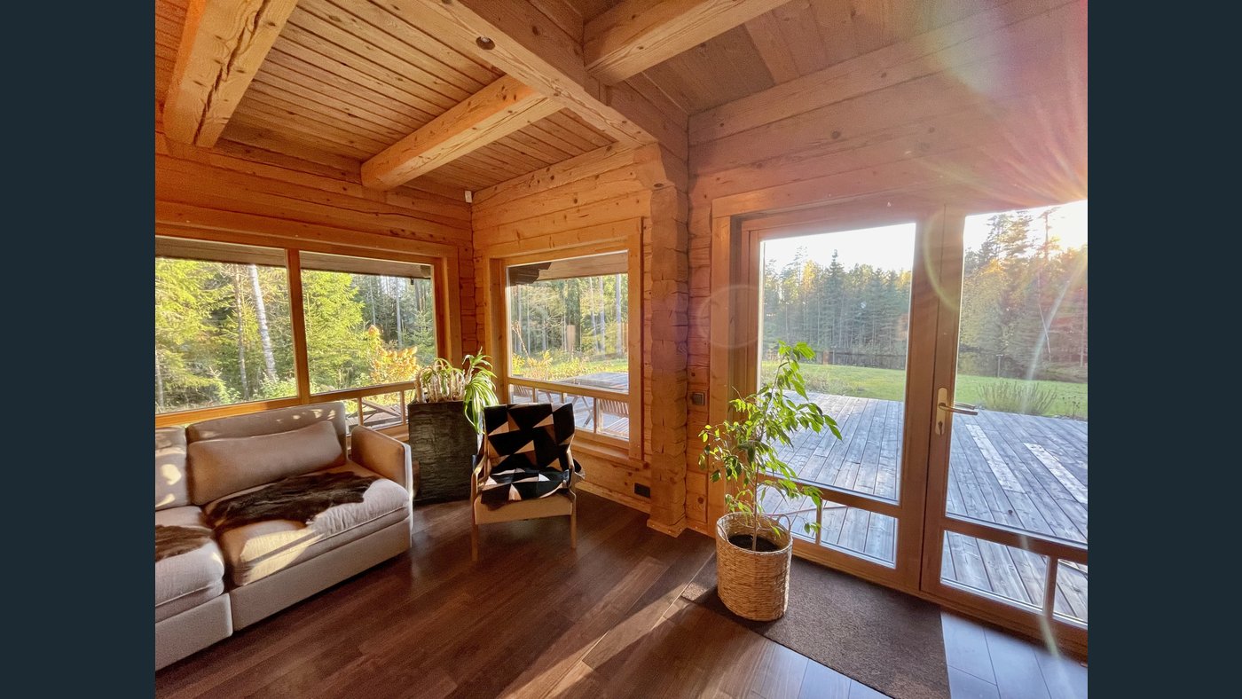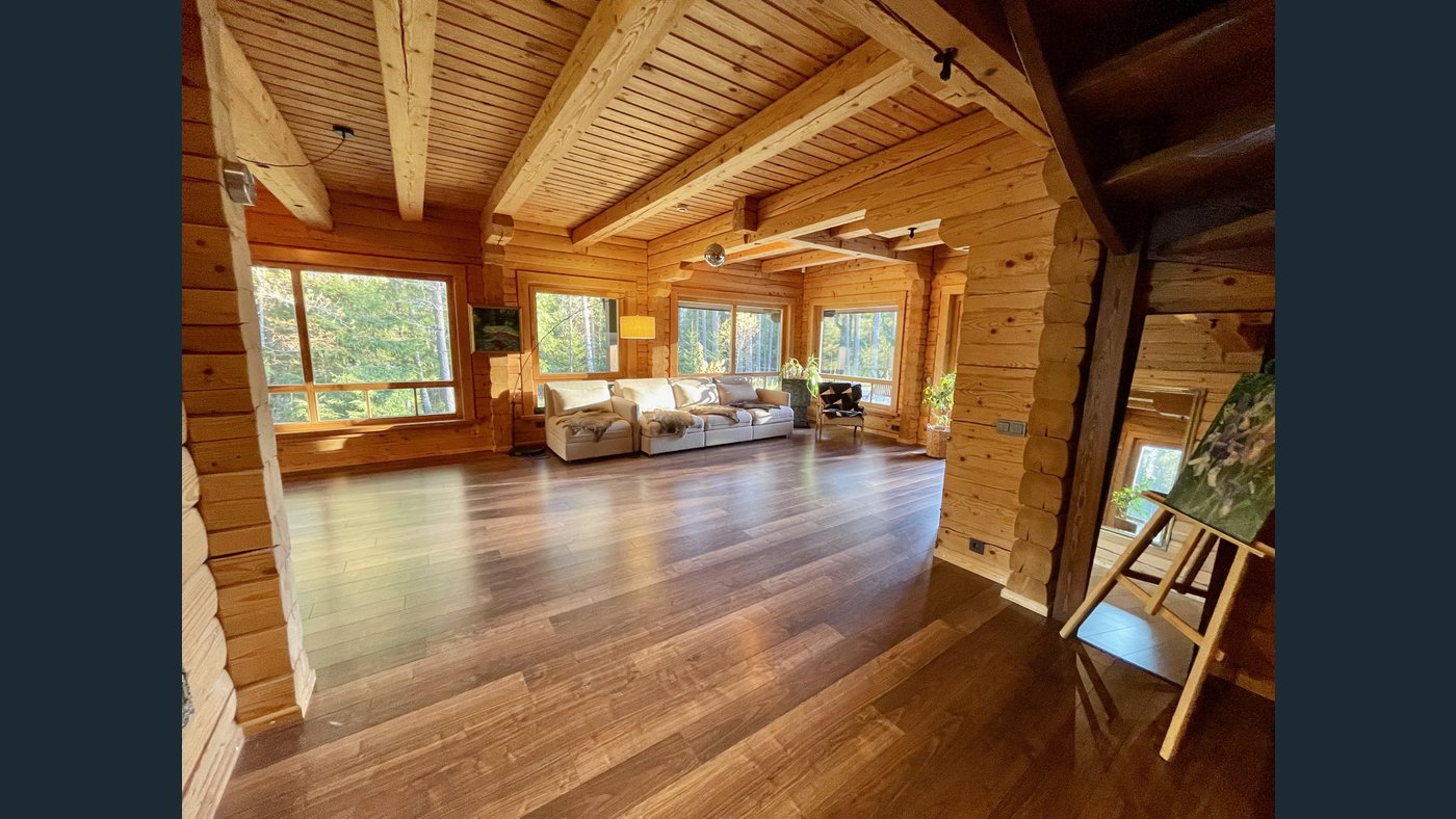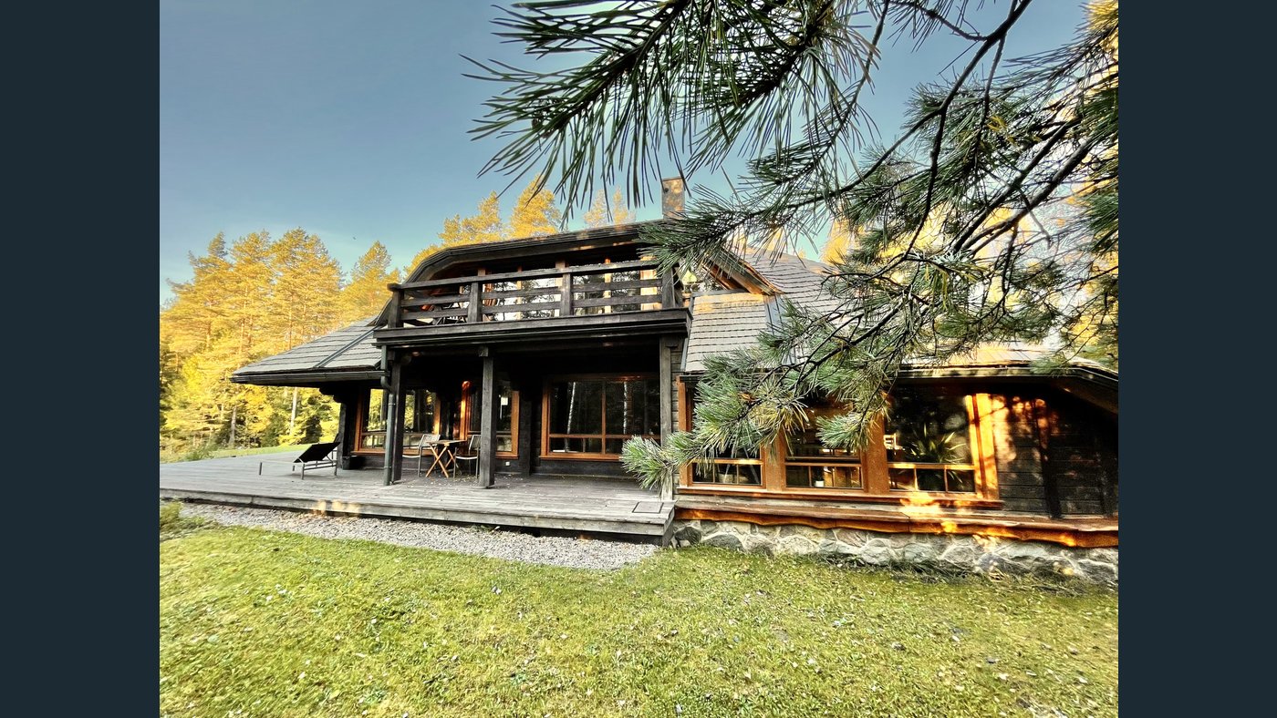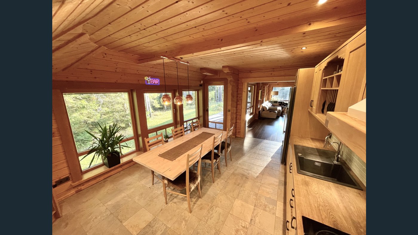 This charming two-storey log house features a newly replaced wooden shingle roof (2025). The property is completely surrounded by forest and offers direct access to a pond with a private island, creating a truly unique and secluded outdoor environment.