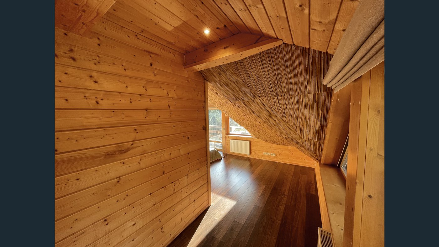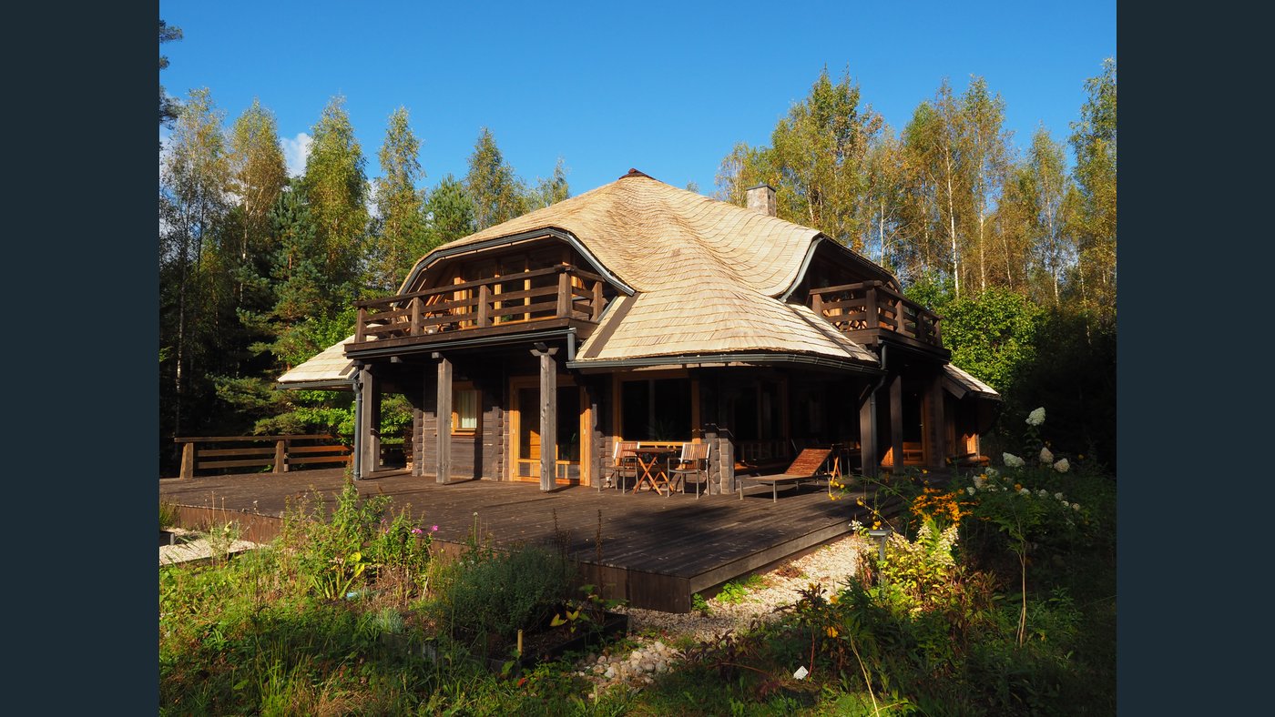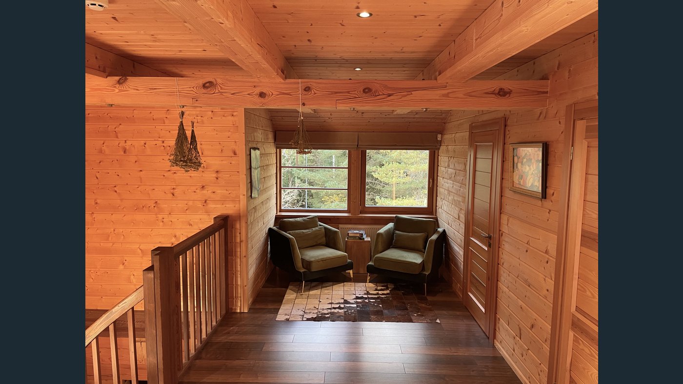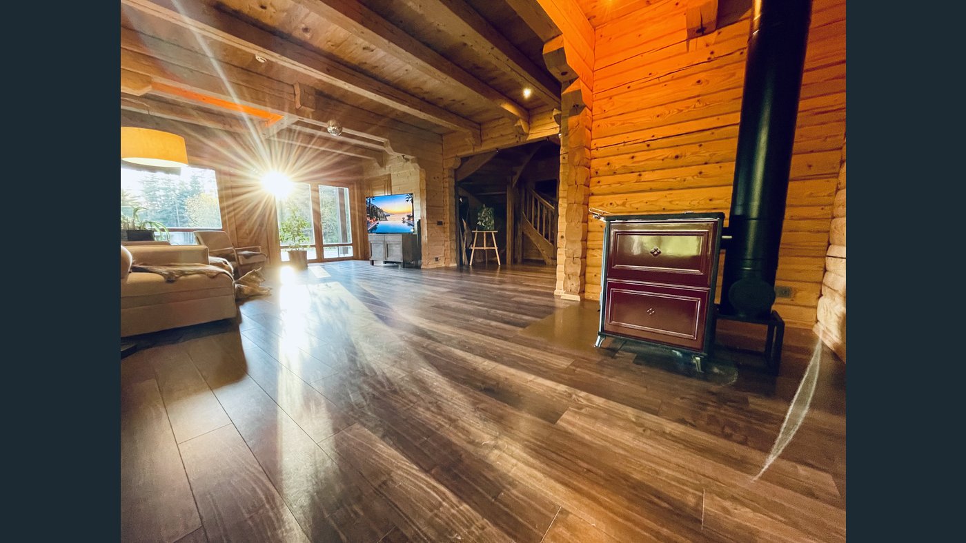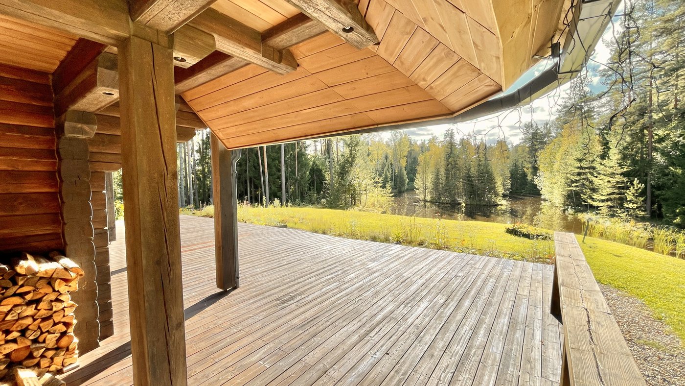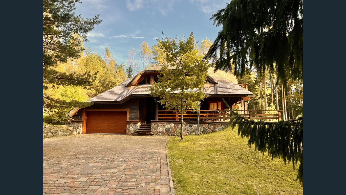 This charming two-storey log house features a newly replaced wooden shingle roof (2025). The property is completely surrounded by forest and offers direct access to a pond with a private island, creating a truly unique and secluded outdoor environment.