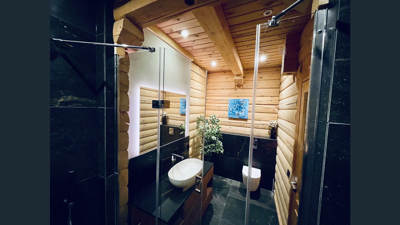 Heating is provided by an energy-efficient heat pump, complemented by the wood-burning stove in the main living area.