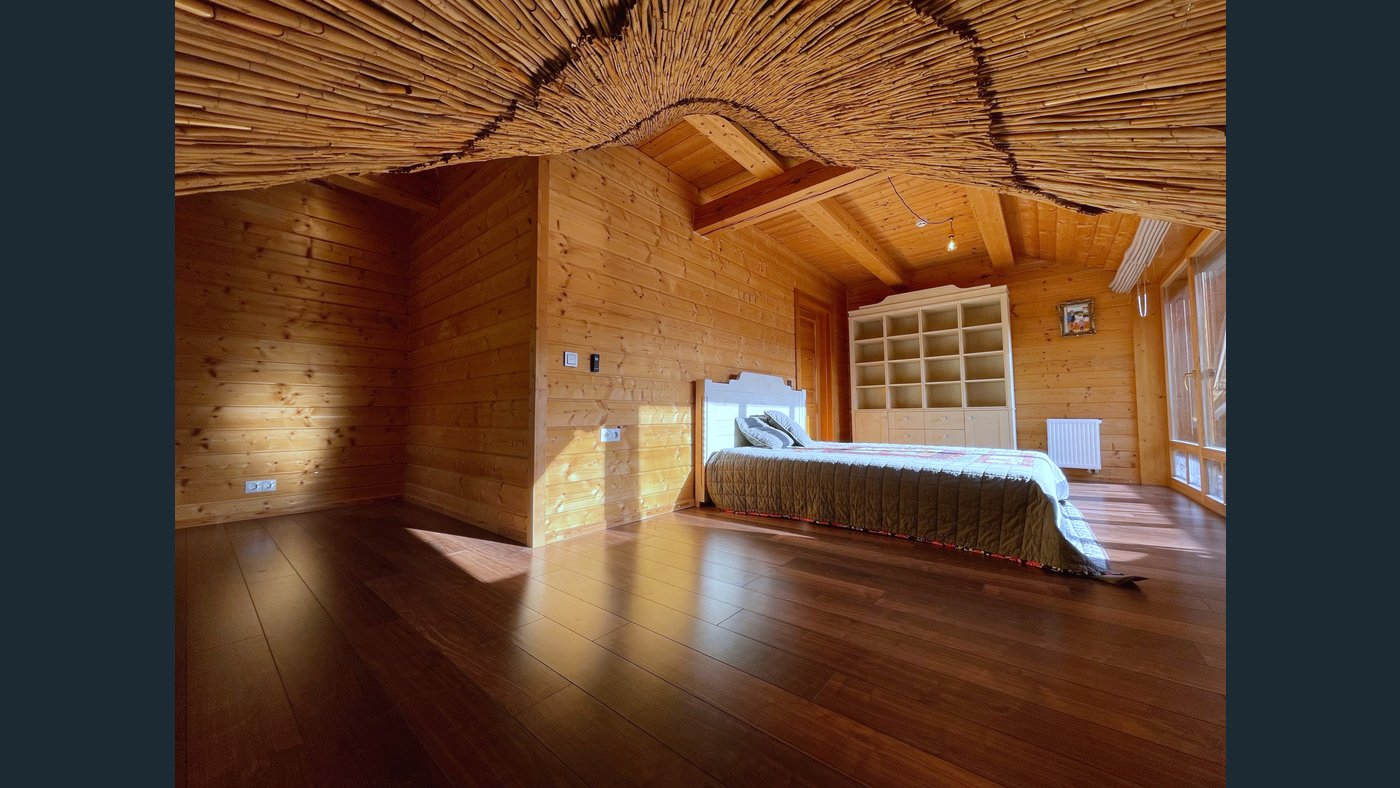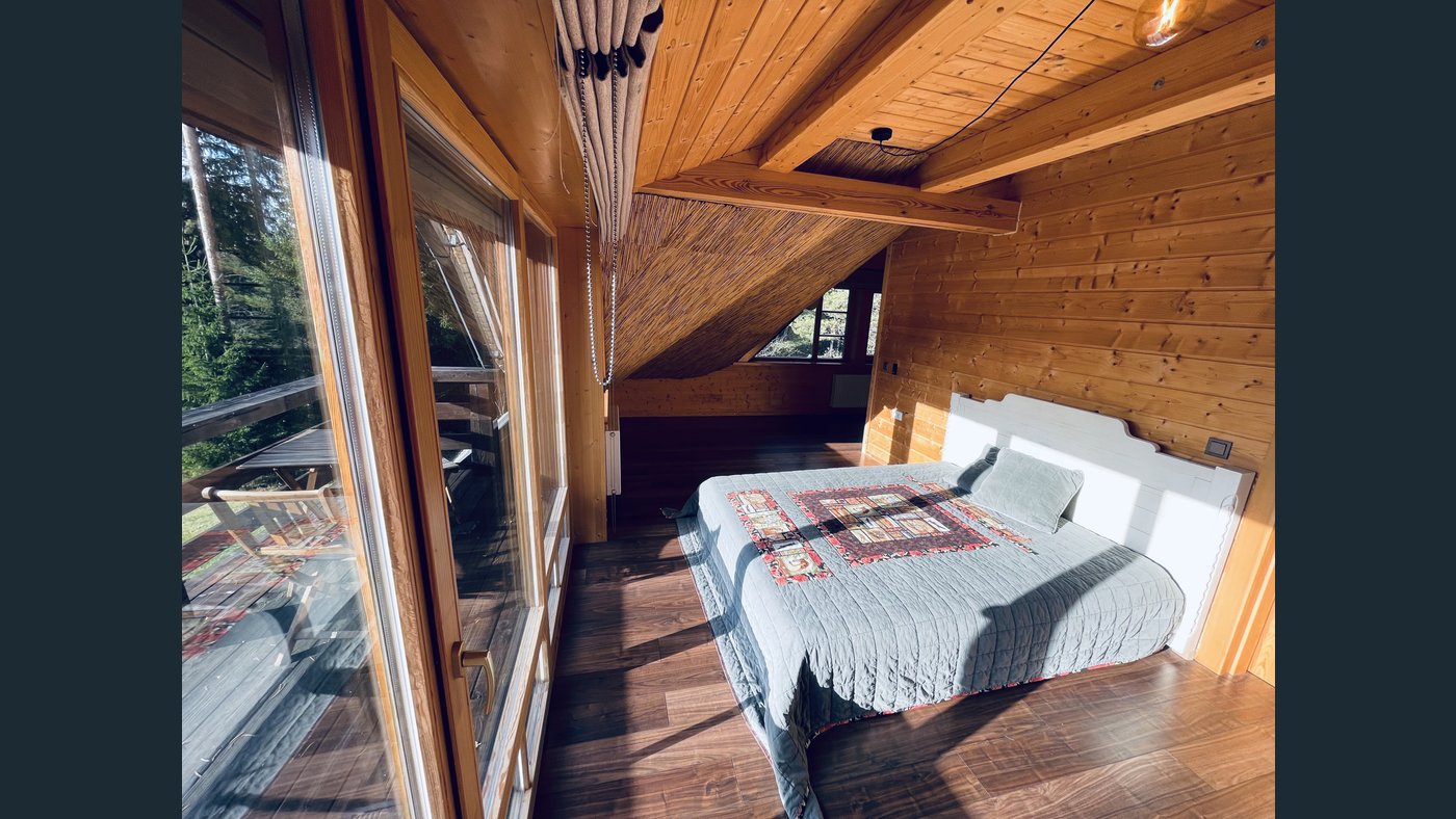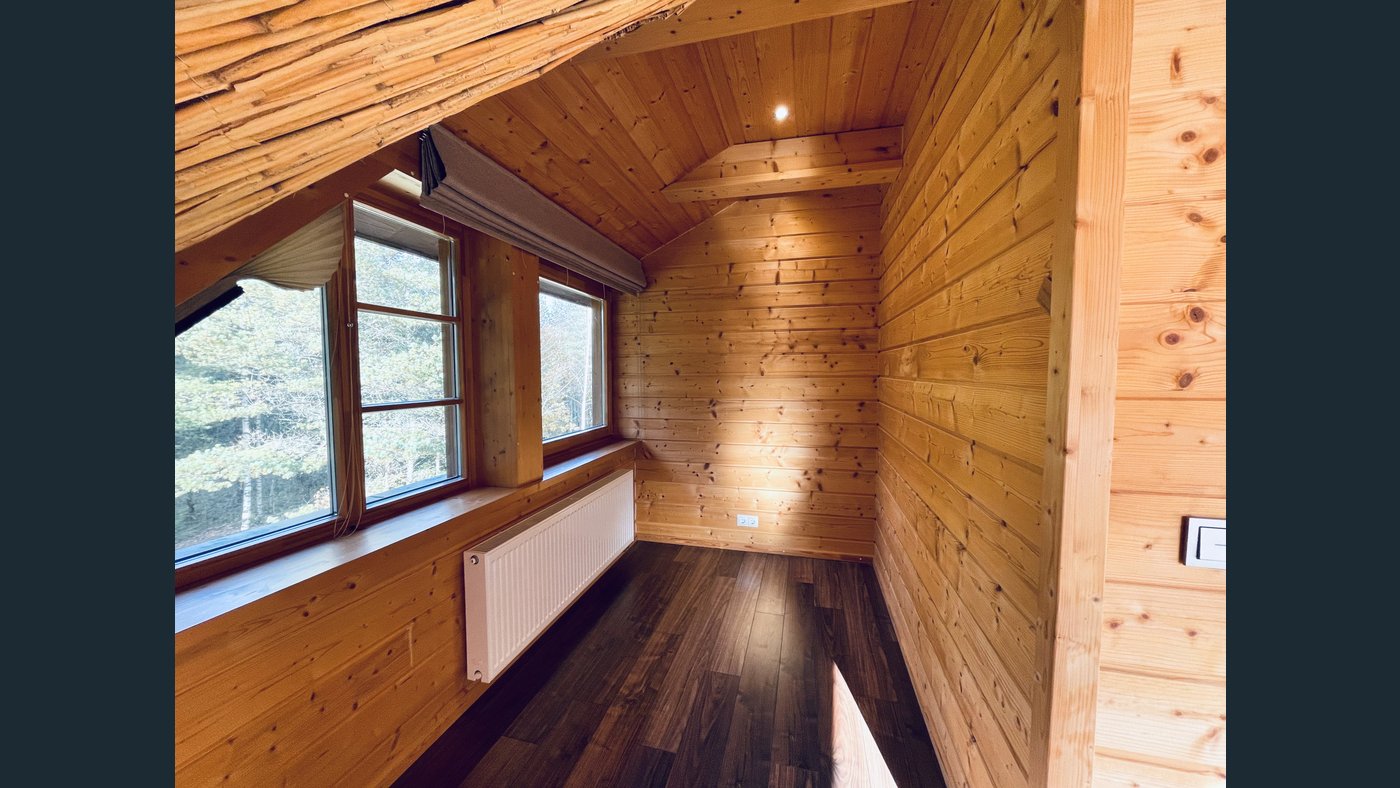 The house has a well-thought-out layout, ideal for both family living and peaceful retreats. It includes four bedrooms, two bathrooms, a spacious living room, a kitchen, and a small office or guest room. The living room is equipped with a wood-burning stove, which not only adds warmth and character but also allows for cooking.